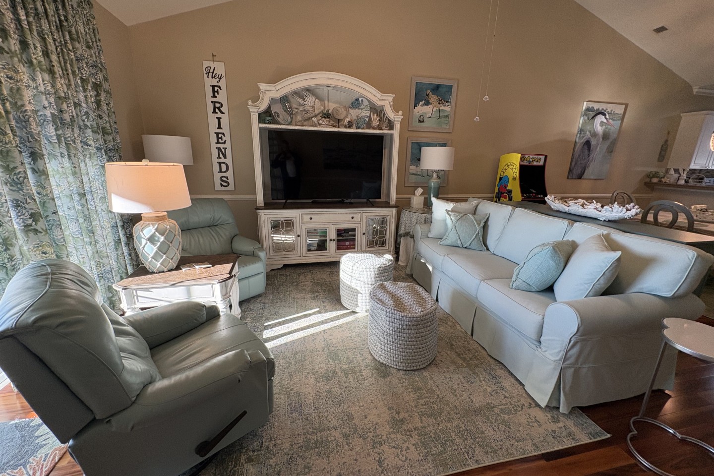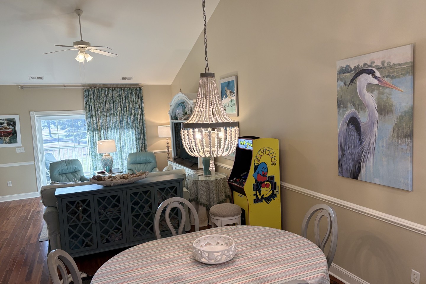 Nice and quiet, top floor unit. Soaring cathedral ceilings. Elevator. Golf course view. Screened in porch with sunset view. PAC-Man arcade machine in unit. Sleeps 4. TV in each room. Washer/ Dryer in unit. Easy 5 minute drive to beach. There is a 13% Sales Tax in addition to your nightly rental. No Children under 12.