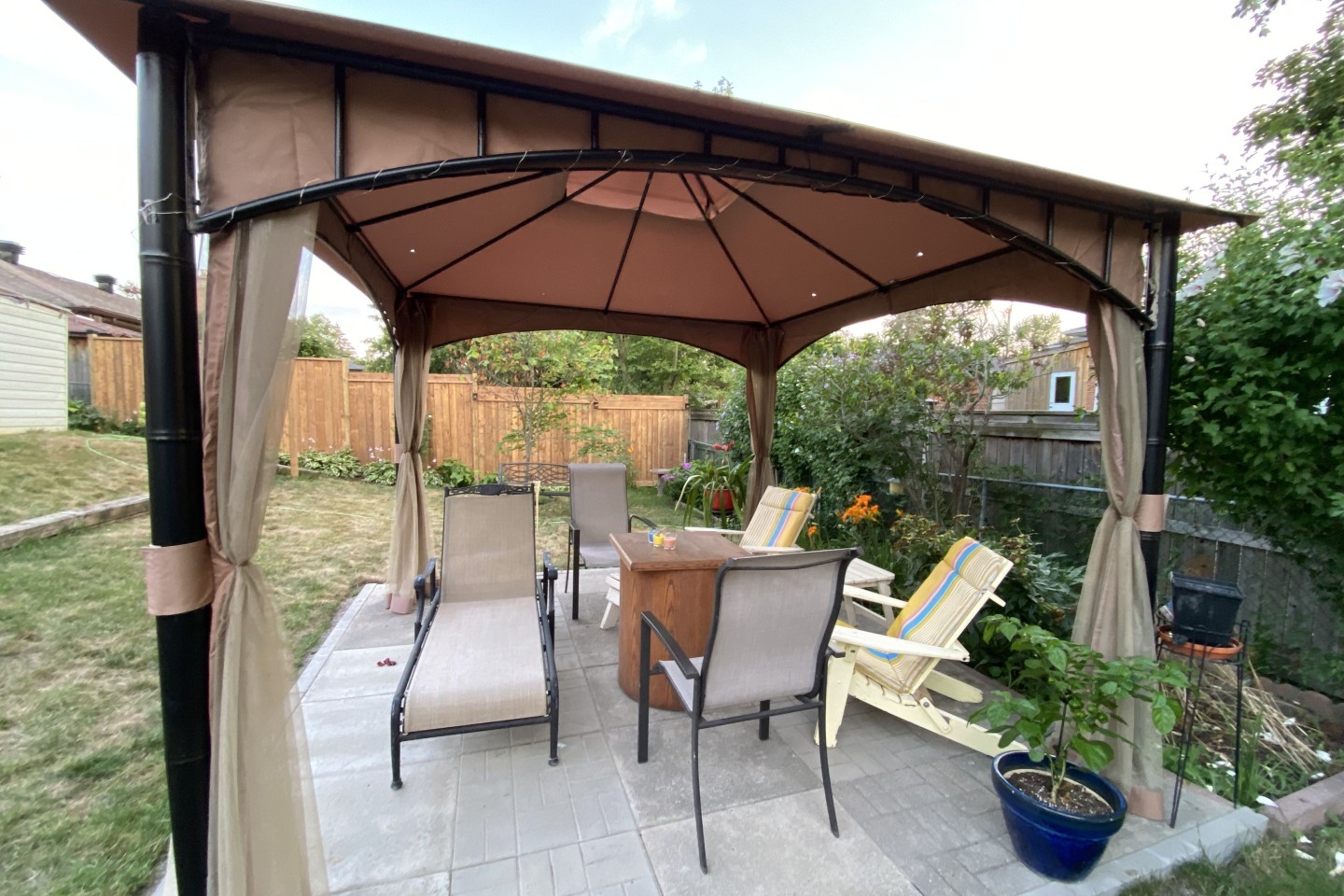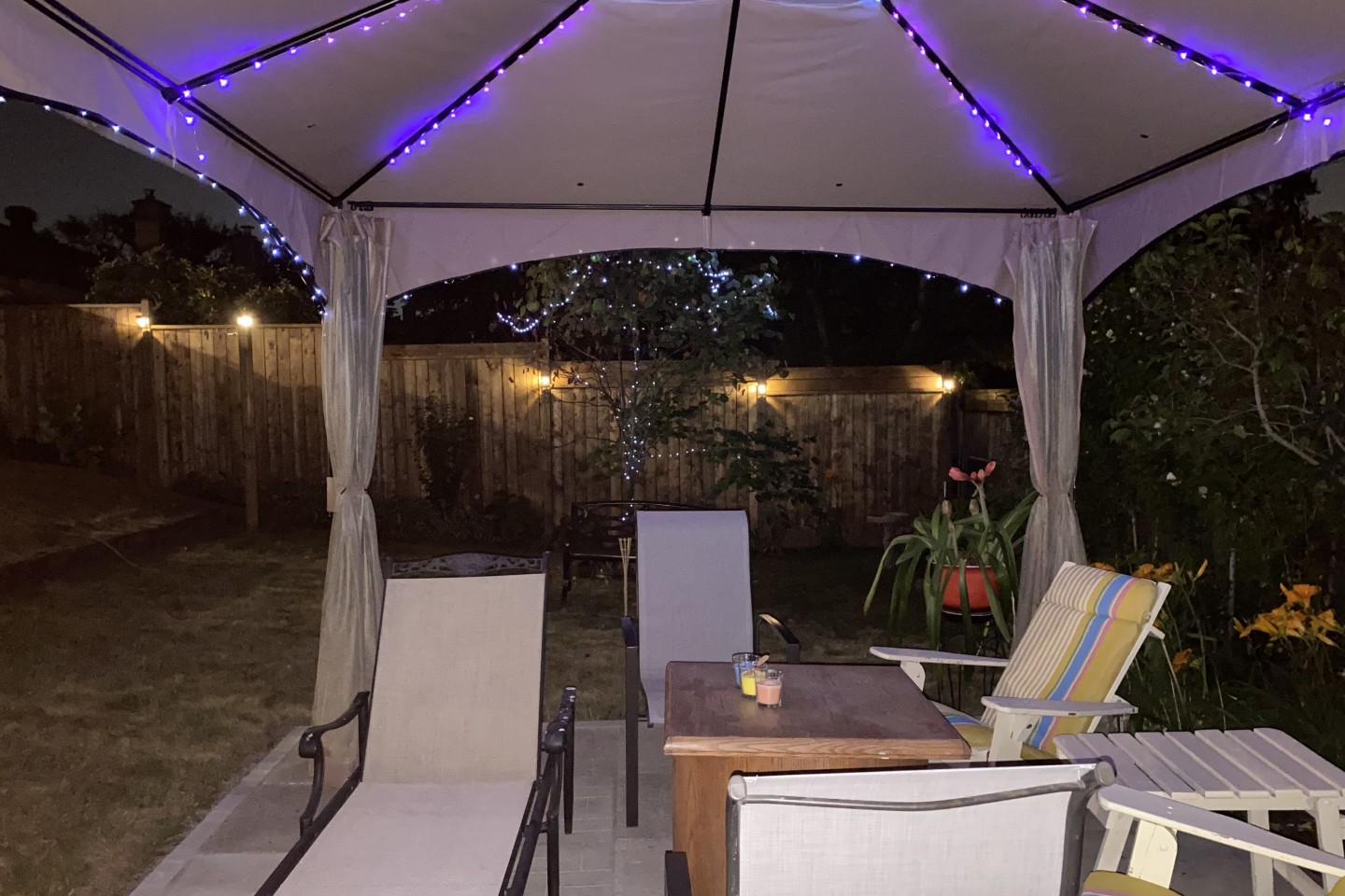 Beautiful back yard with gazebo available for relaxation , barbeque and chairs and soft night lighting for a warm star lit evening.