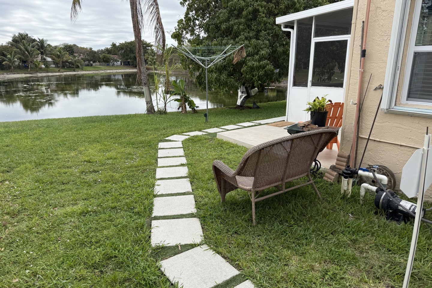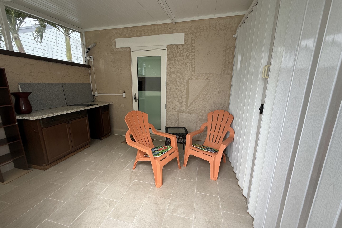 Space: One bedroom with private entrance, walk-in closet, half kitchen, full bathroom with enclosed toilet, enclosed patio with half kitchen and lake view.