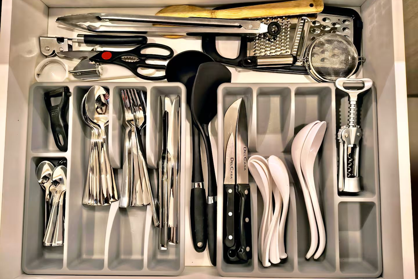 coffee maker, cooking utensils, dishes, and silverware -