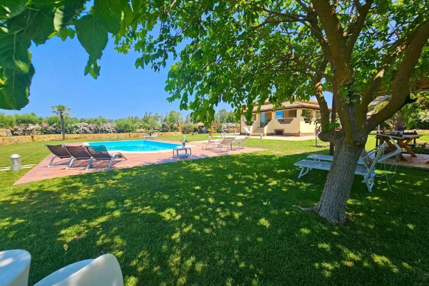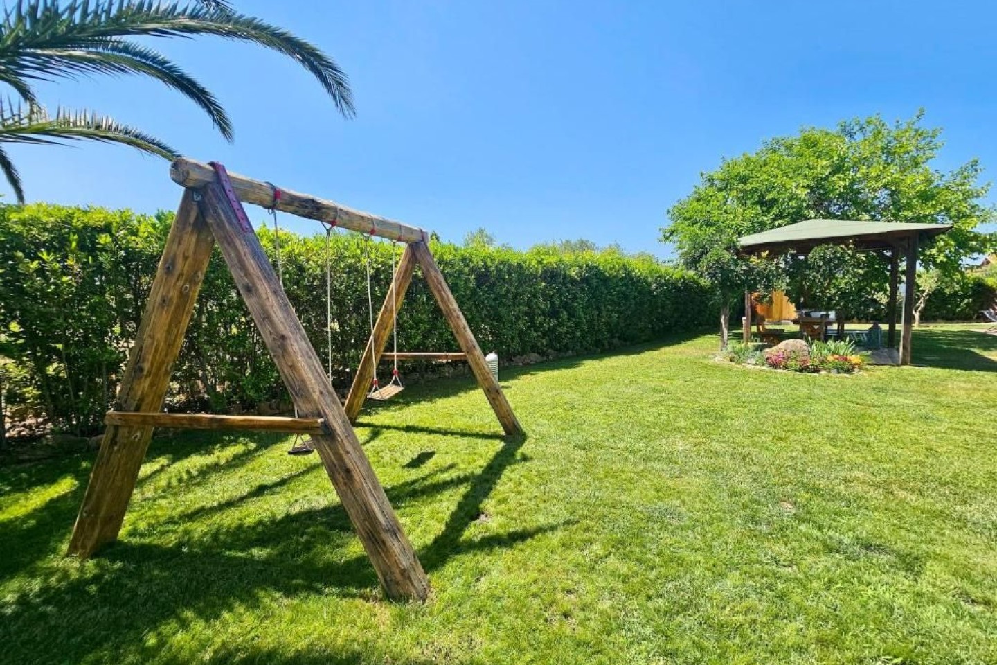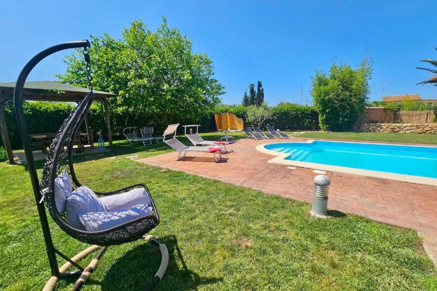 Outdoor fun and wellness The garden is a true oasis of peace with a private swimming pool (10m x 5m) where the whole family can relax and enjoy themselves, with a child-friendly area. Around the pool you will find sun loungers, parasols and a covered veranda with barbecue, ideal for al fresco dining. The large gazebo next to the pool is the perfect place to enjoy the garden with friends and family. Equipped areas for families To ensure the safety of children. This makes Villa le Palme perfect for families who want a relaxed and safe environment. We also provide bicycles free.