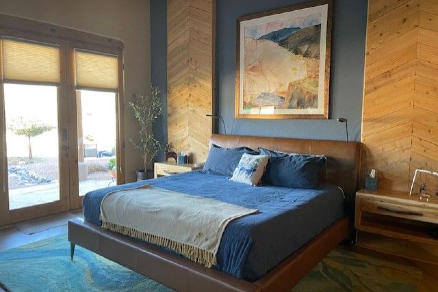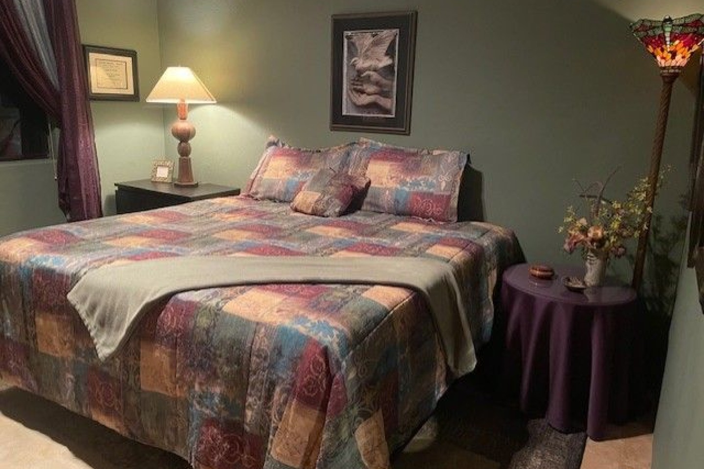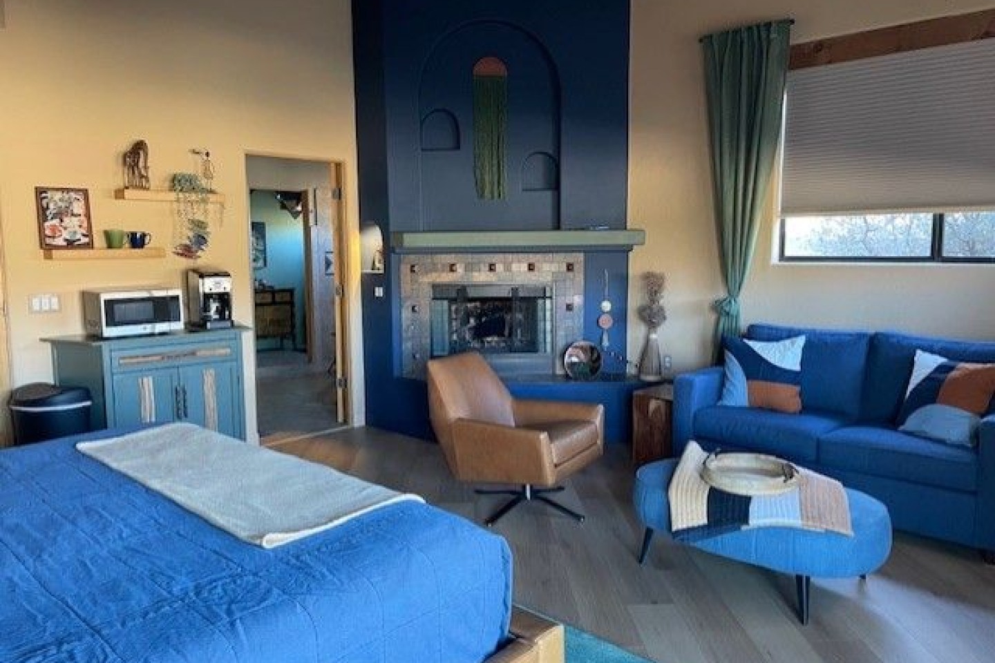 Our 4 bedroom, 3 bath home sleeps up to 11 guests. In the primary suite there is a king size bed with an organic mattress, a fireplace and jacuzzi tub. There is also a sitting area with couch and chair. The second and third bedrooms each have a queen bed and share a bathroom. The fourth bedroom is set up as a massage room and can be converted to a king bed or two twin beds.