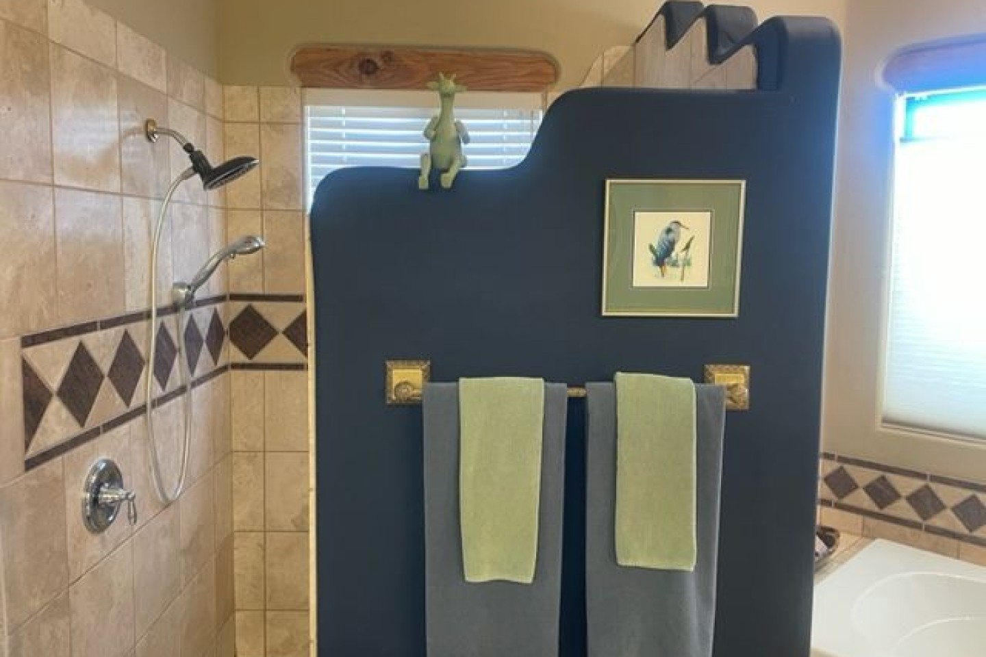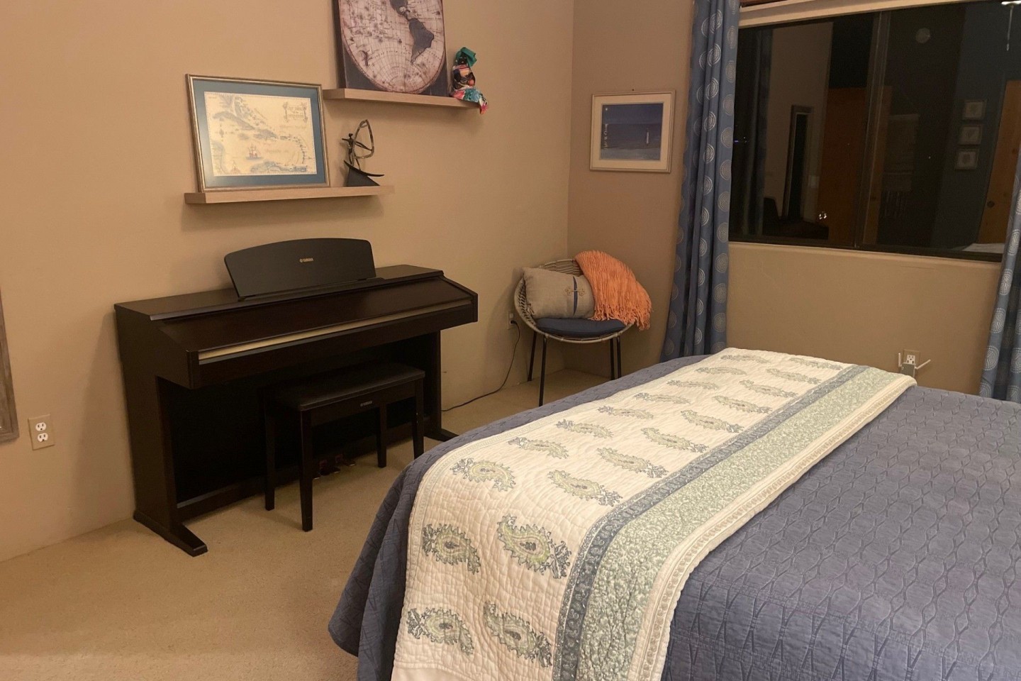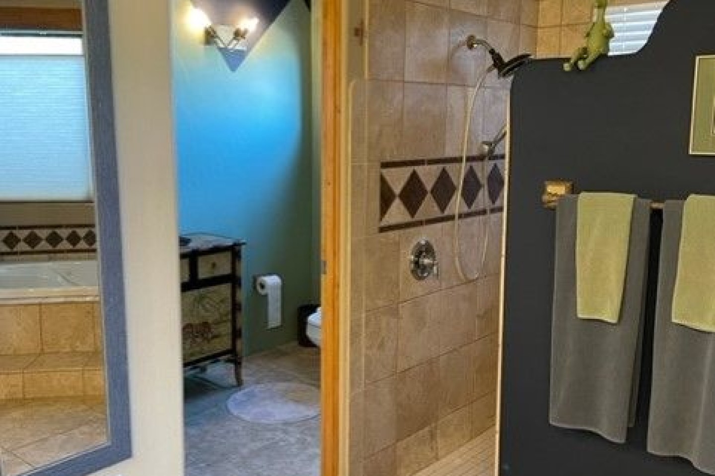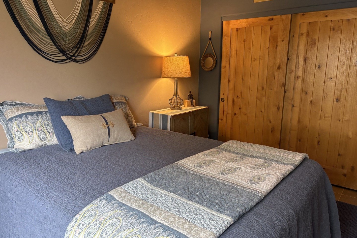 Our 4 bedroom, 3 bath home sleeps up to 11 guests. In the primary suite there is a king size bed with an organic mattress, a fireplace and jacuzzi tub. There is also a sitting area with couch and chair. The second and third bedrooms each have a queen bed and share a bathroom. The fourth bedroom is set up as a massage room and can be converted to a king bed or two twin beds.