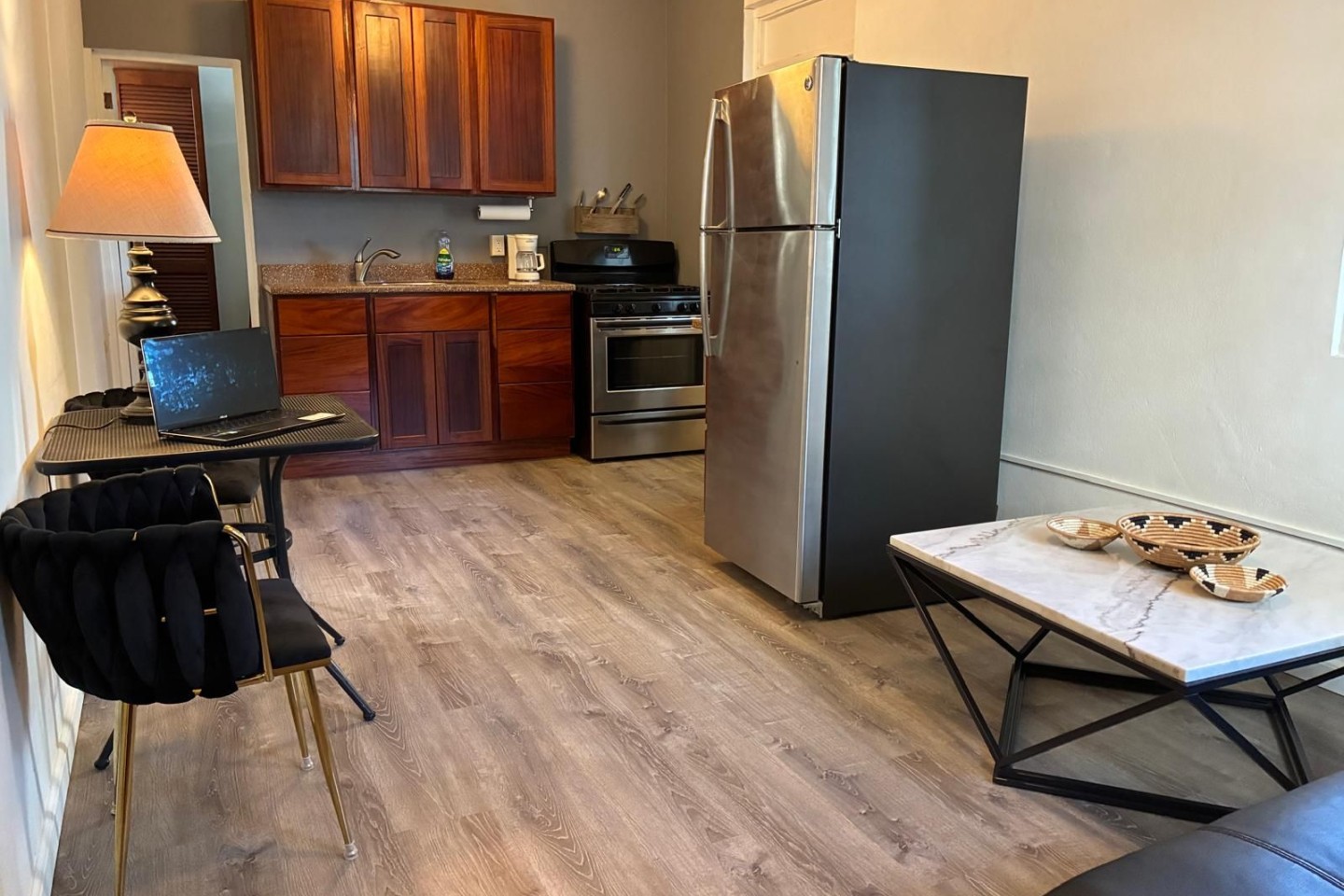 In the kitchenette a fridge, range and oven, sink, coffee maker are all available. You will have wireless internet access upon request. An air conditioner in the main area is available while in the space. An additional air mattress is available for use upon request. The deck, backyard garden & balcony are all shared access.