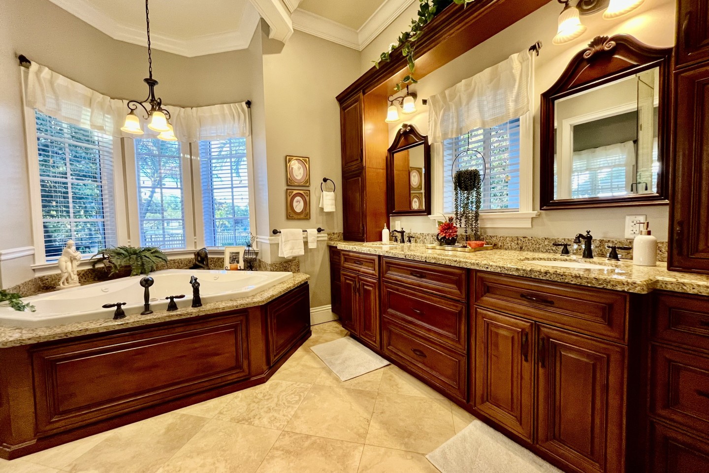 House sits between 2 lakes. Guest can enjoy sitting in the front porch with views to the front lake and also sit in any of the back yard sitting areas with views to the back lake.