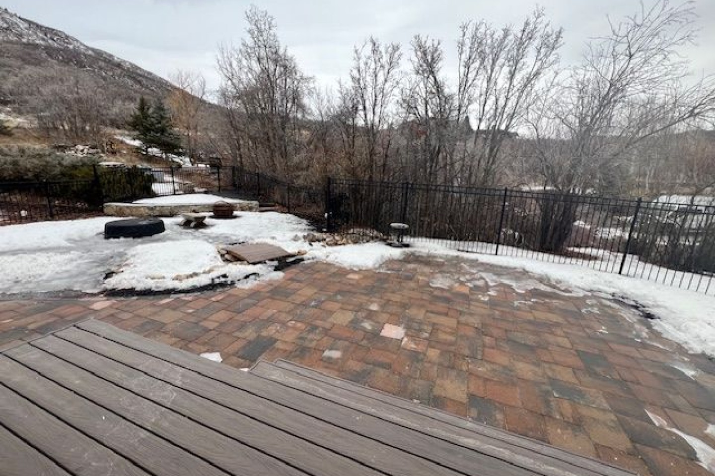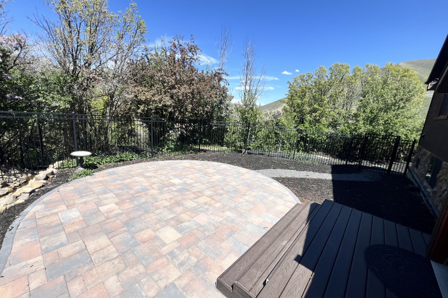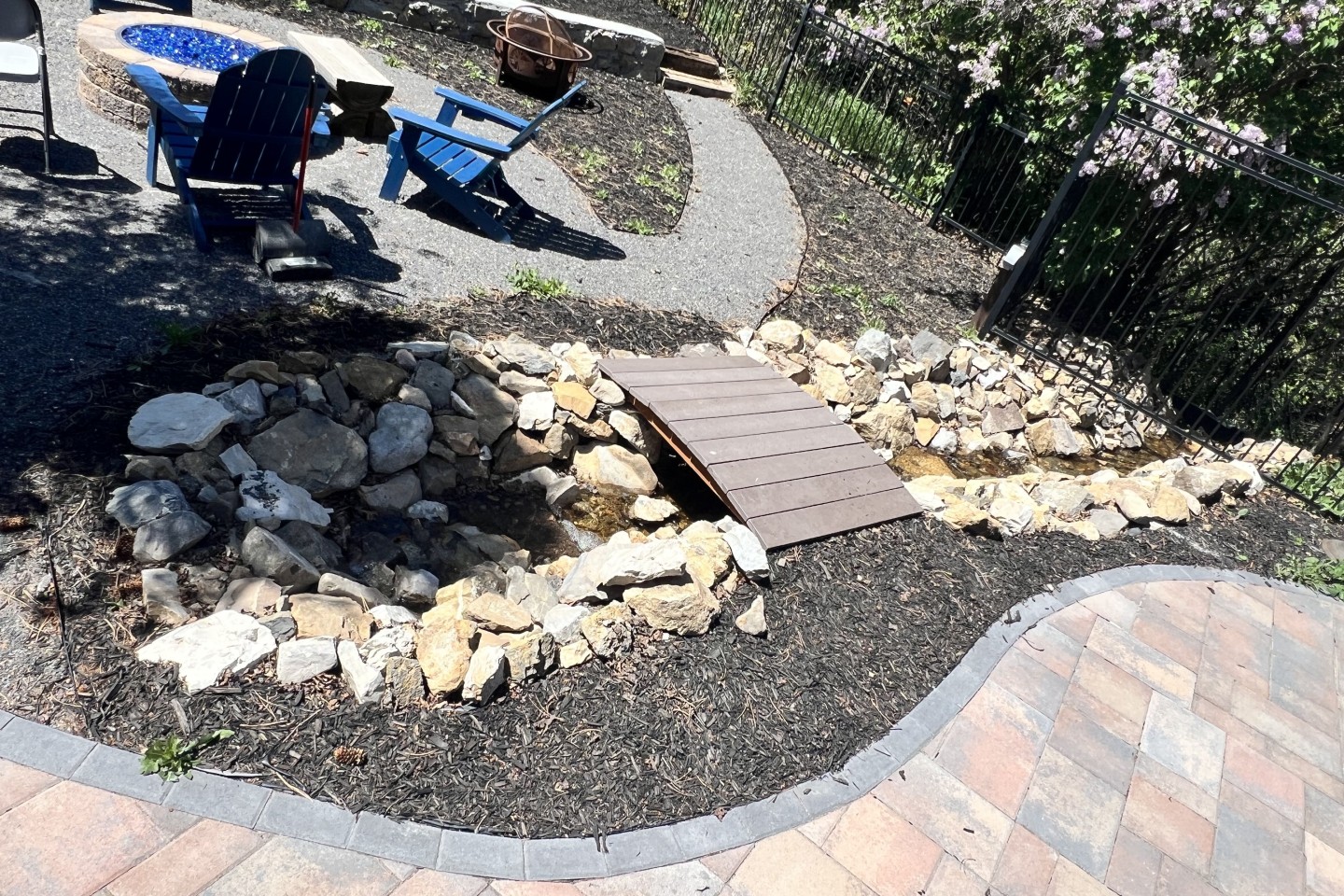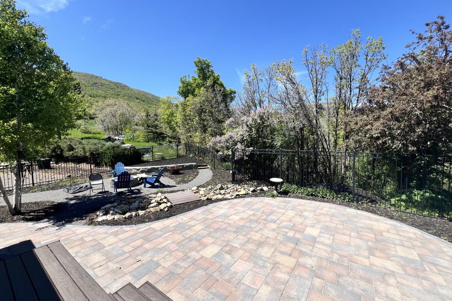The backyard is completely fenced in with multiple gateways to the surrounding area, and has a peaceful babbling brook (only in the warmer months), custom stonework, a built-in gas fire pit and 12 blue, fold-up Adirondack chairs for your comfort.