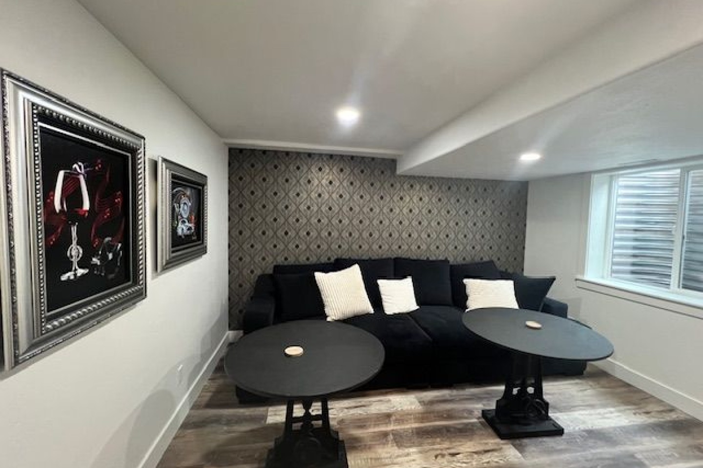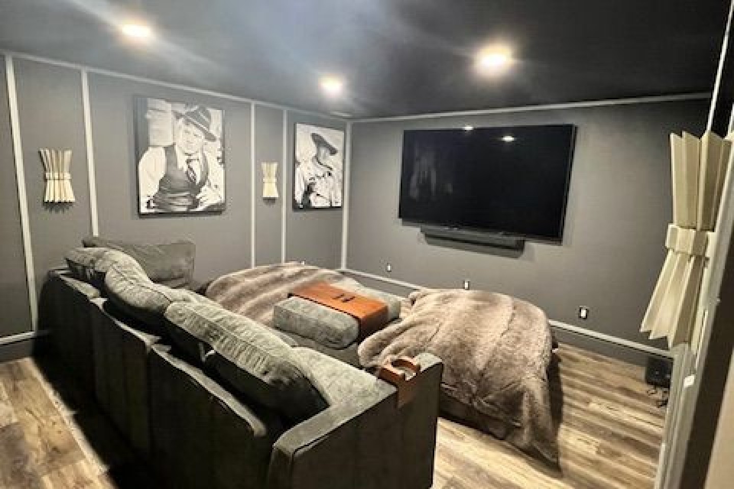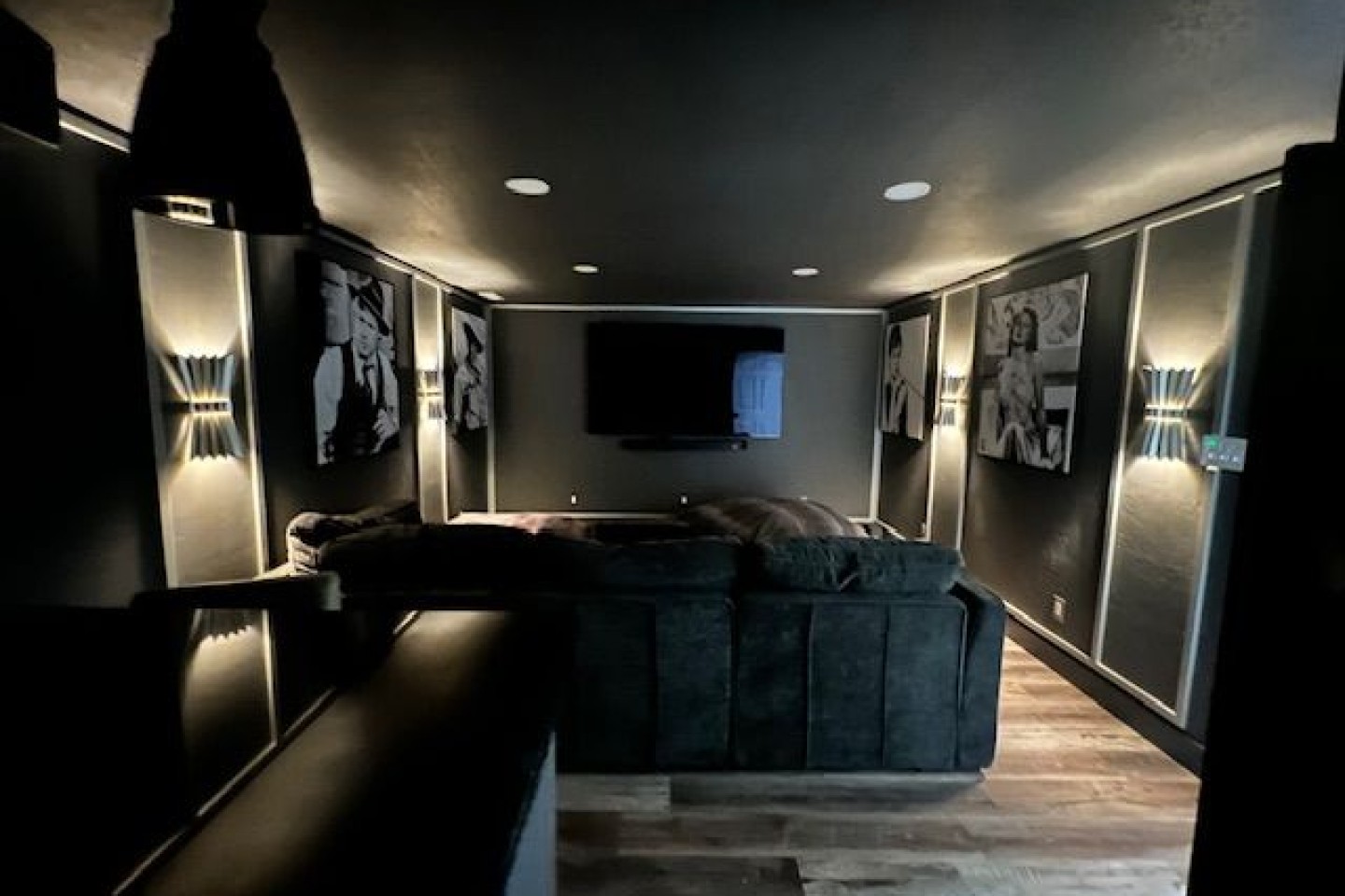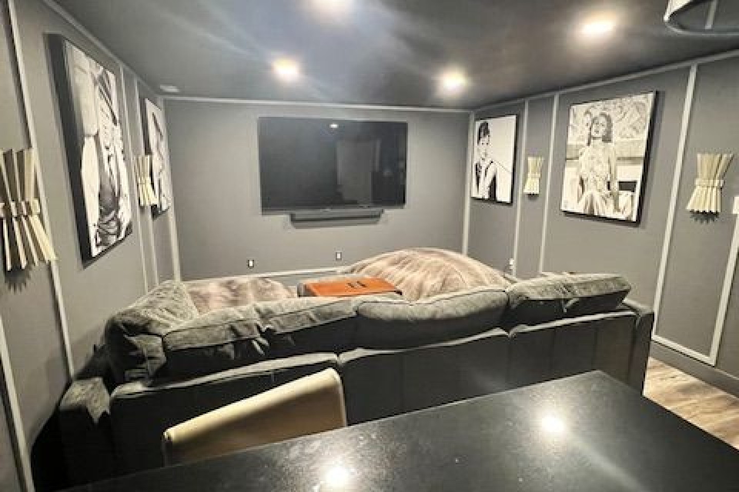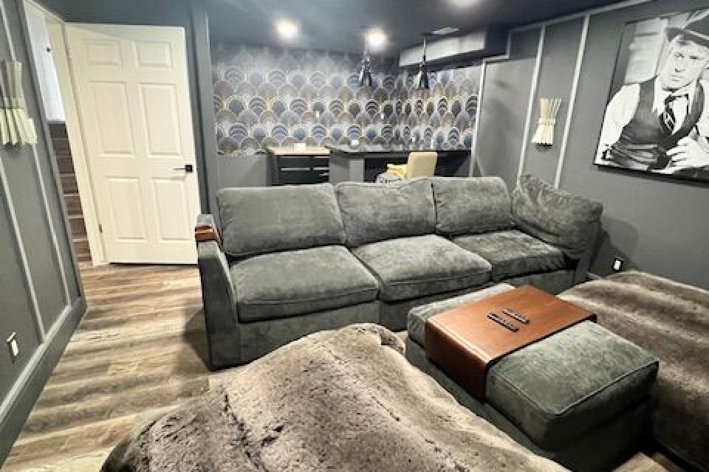 Along with the bedrooms, the lower basement has the most comfortable 11-foot couch you’ve ever been on, all in a game room setting. Walk through the door and there is an old MGM/Art Deco inspired theater room, complete with an 80” TV and surround sound system. Need snacks? A small fridge is complete with waters as well as Pepsi and A&W products. The snack bar includes various candies, nuts and Red Vines. And enjoy popcorn in the provided machine.