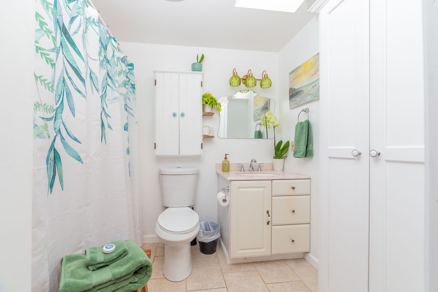 The light-filled full bathroom has a heated floor for your comfort and is supplied with luxurious towels, and robes. Soap, shampoo, and conditioner are supplied, and there is a large selection of personal items for you to use in case you forget something at home!
